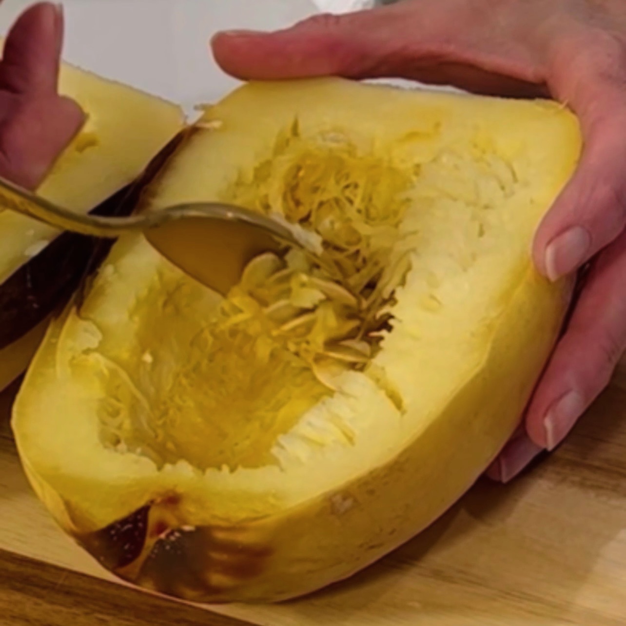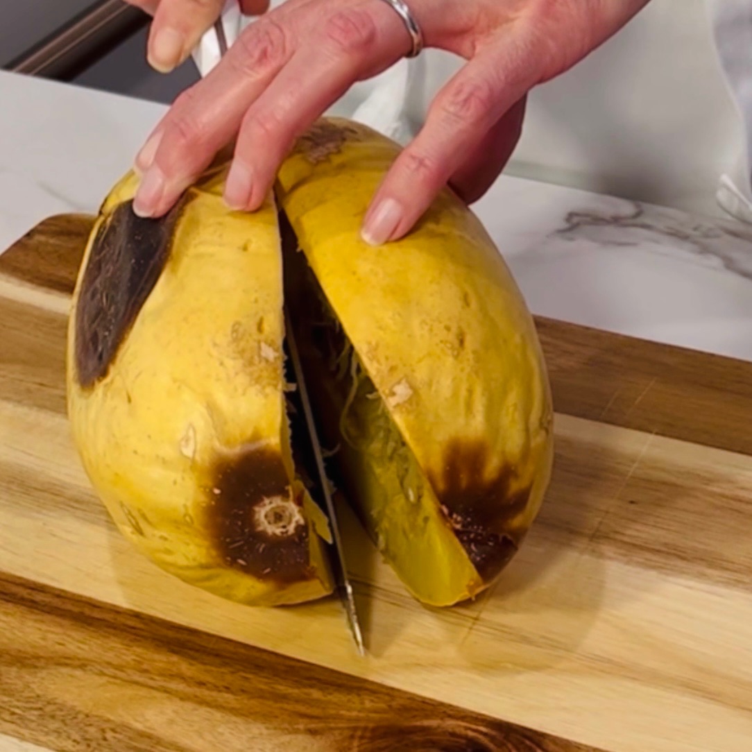 After baking, it’ll be soft, and MUCH easier to cut! Grab a knife and cut right down the middle (it cuts like butter!). Then, easily remove the seeds and fluff with a fork.Â
