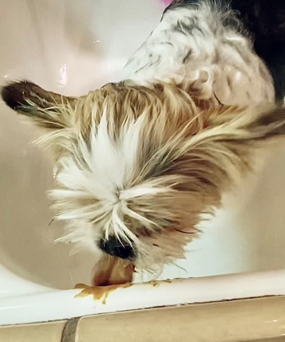 The secret is… peanut butter! Just stick a little bit of peanut butter on the side of the sink. The dogs love it, and it buys you time to get your little guys extra clean.