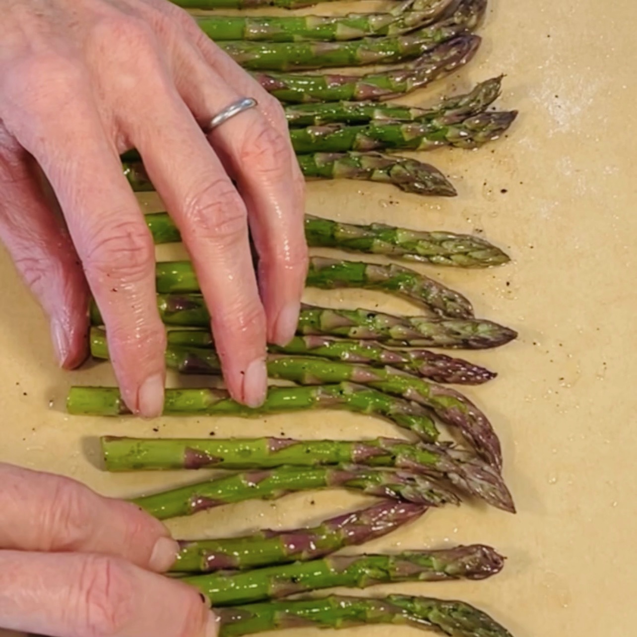 Grab a test piece, hold it on the ends, then bend & snap. The head will be what you roast and the other end is compost! Line a baking tray with parchment paper and add a heavy drizzle of avocado oil and sprinkle some LORAfied Magic Seasoning. Gently toss it and bake at 400F for 15 – 25 minutes, depending on how done you like them. Option to Top with parmesan!